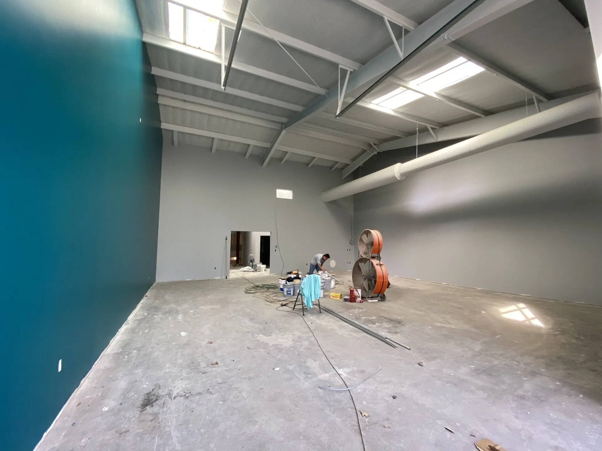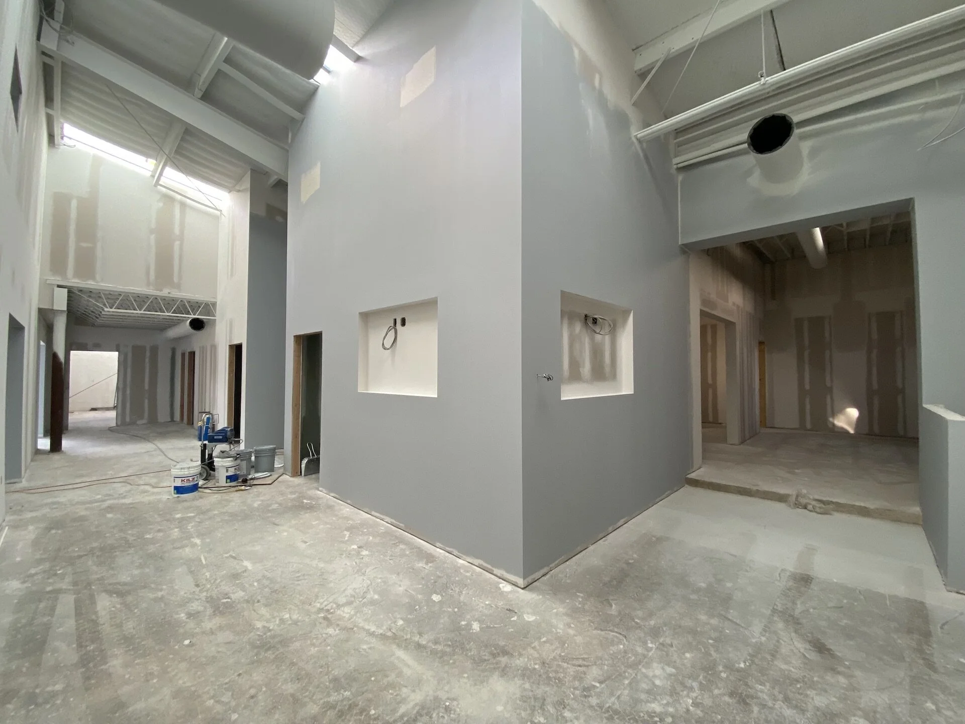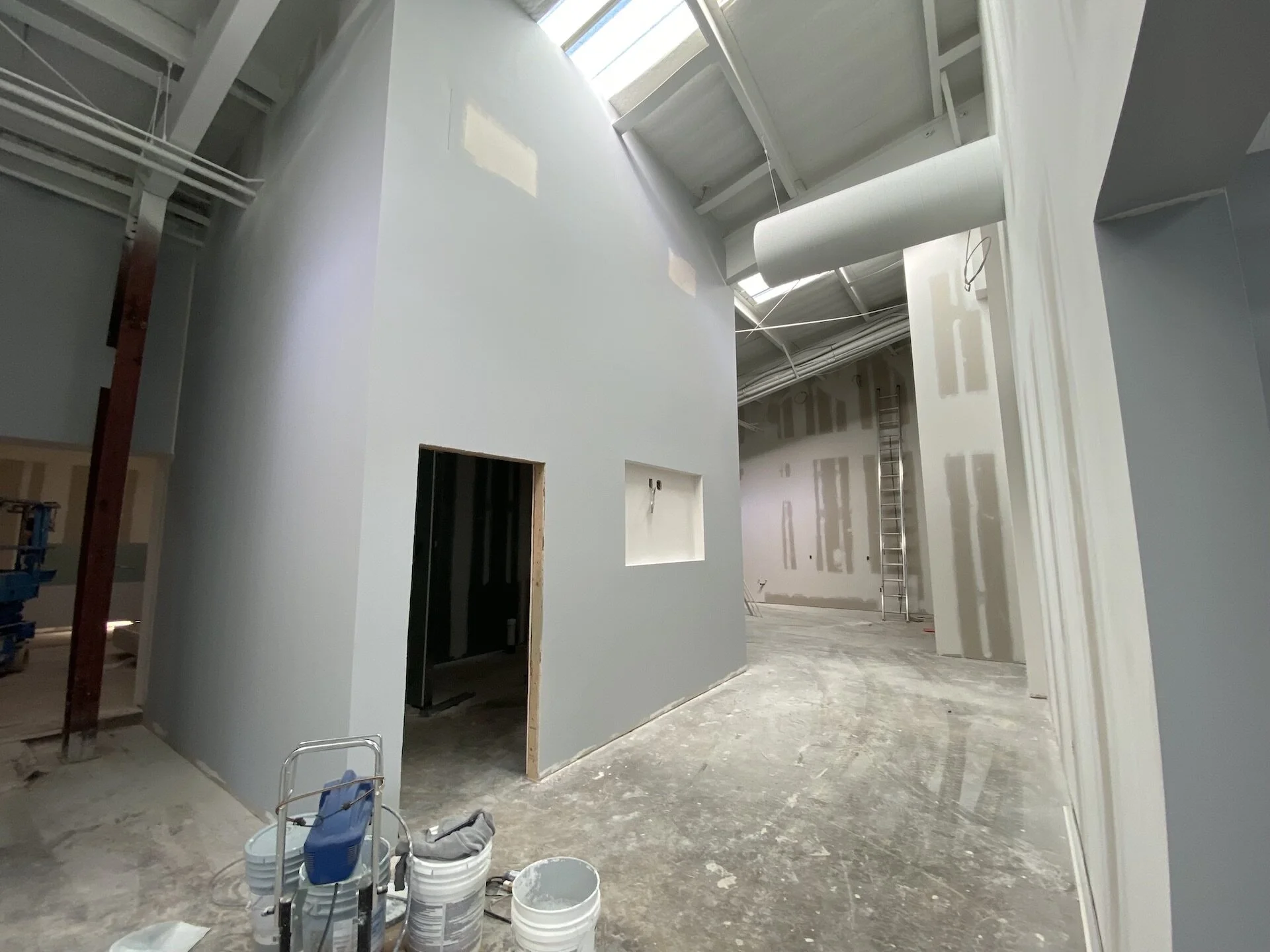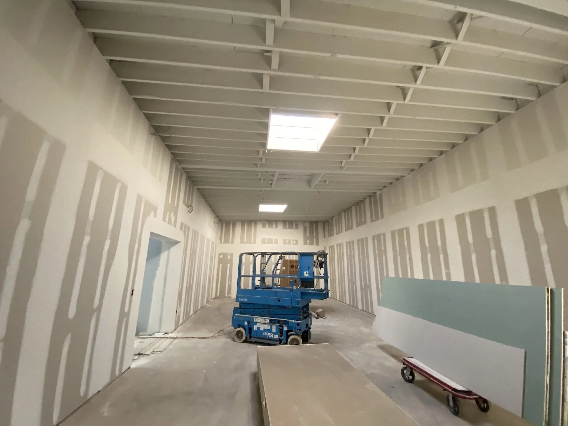 Wall cover continues. Tape and float continues. HVAC stud work on ceiling.