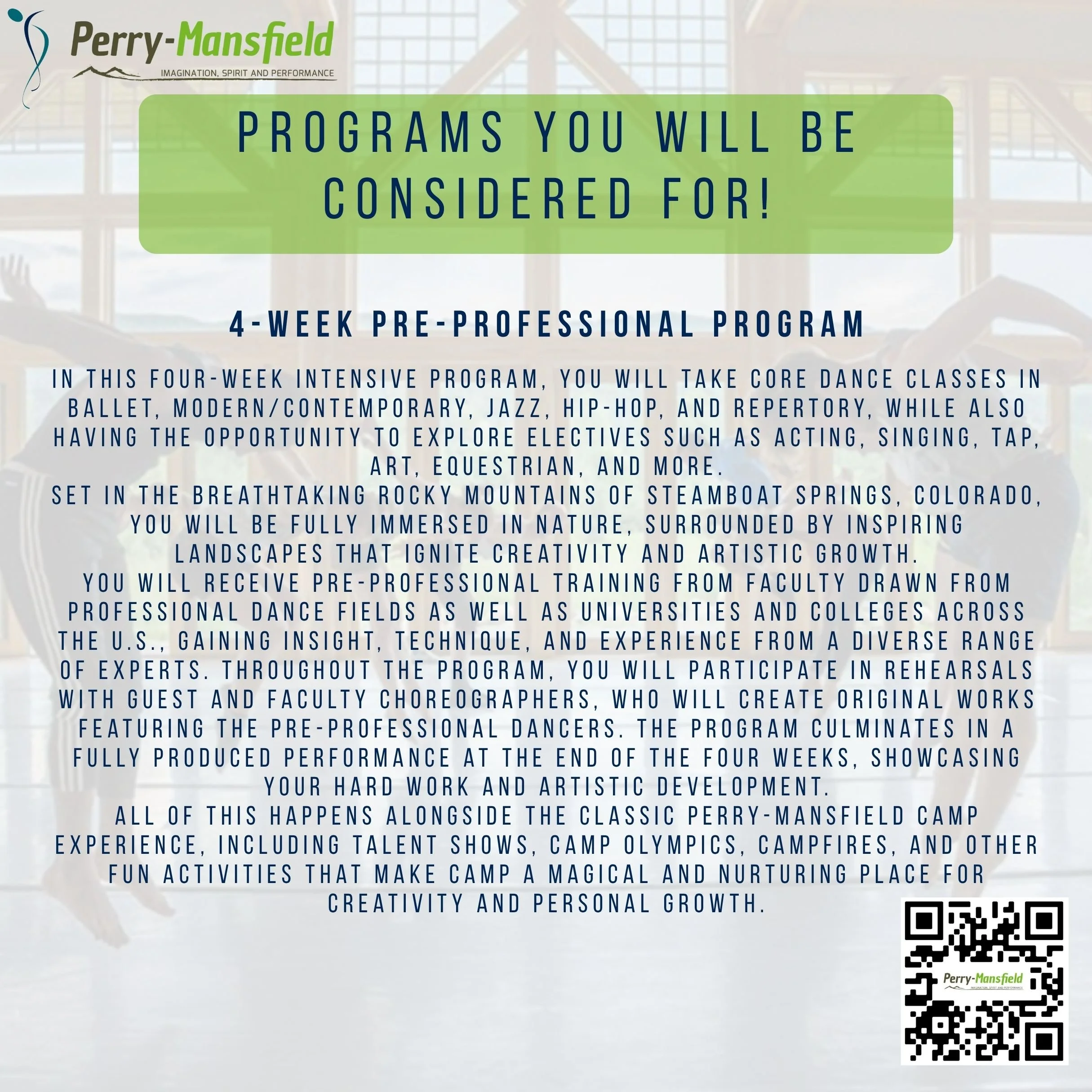 Perry-Mansfield is coming to the Institute! Join Christopher Compton for an Audition class on Monday, October 13th from 6:30-7:45PM! The class will consist of a ballet barre and a contemporary combination.